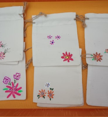 The rope pouches with hand painted flowers are my humble attempt to contribute to the environment (reduce, reuse and recycle) - ART by Ruchika